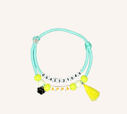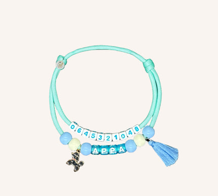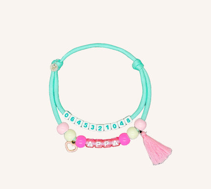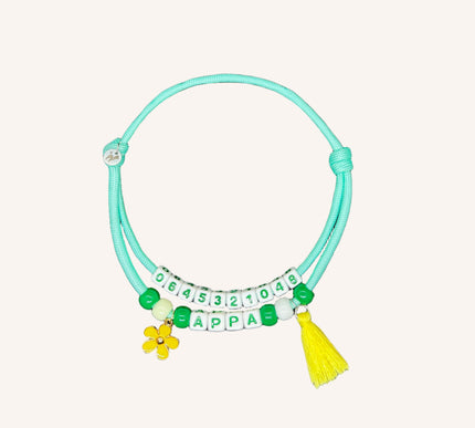 Bij sommige onderdelen werken we met vaste combinaties, zodat de kleuren perfect bij elkaar passen. Bijvoorbeeld: blauwe naamkralen komen met blauwe en witte ronde kralen. Zo blijft het ontwerp mooi in balans!