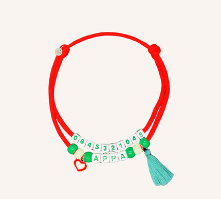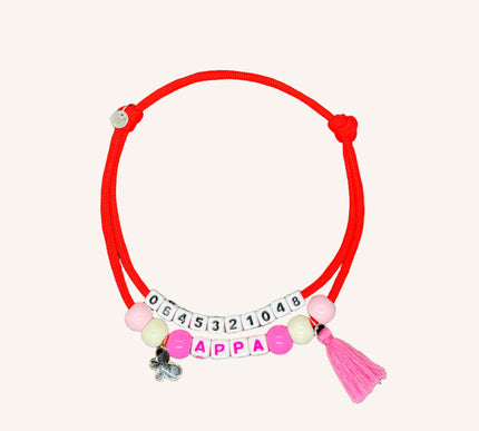 Bij sommige onderdelen werken we met vaste combinaties, zodat de kleuren perfect bij elkaar passen. Bijvoorbeeld: blauwe naamkralen komen met blauwe en witte ronde kralen. Zo blijft het ontwerp mooi in balans!